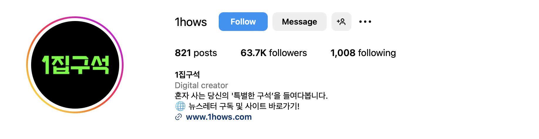 혼자 사는 1인 가정의 잘 가꿔놓은 ‘공간’을 소개하는 계정입니다. 혹시 인테리어에 관심 있거나 자신의 공간을 잘 꾸려나가고 싶은데 센스가 없다, 잘 모르겠다 하시는 분들에게 추천드릴 수 있을 것 같고요. 그게 아니더라도 가끔 들려서 센스 있는 공간 하나 보기만 해도 얼른 내 공간도 잘 꾸려봐야지! 하는 영감도 받을 수 있을 것 같네요.